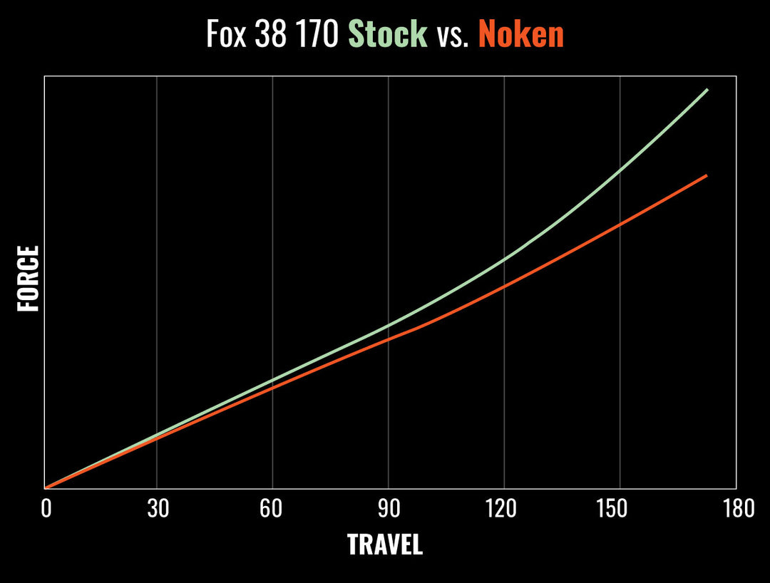The graph above illustrates the change in spring curve with the Noken vs. the stock 38 170mm configuration (with includes two volume spacers).