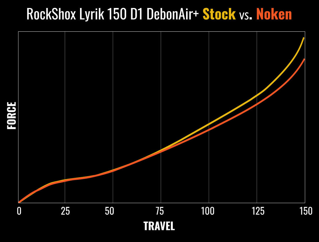 The graph above illustrates the change in spring curve with the Noken vs. the stock Lyrik 150mm configuration (D1 Debonair+ generation with no Tokens).