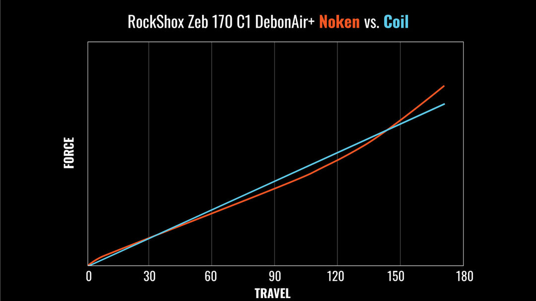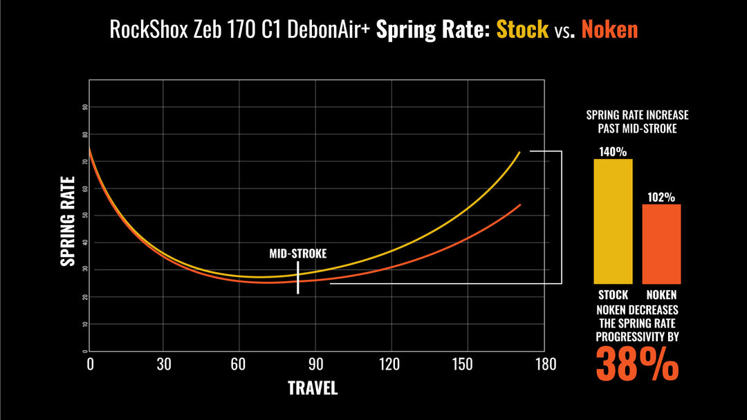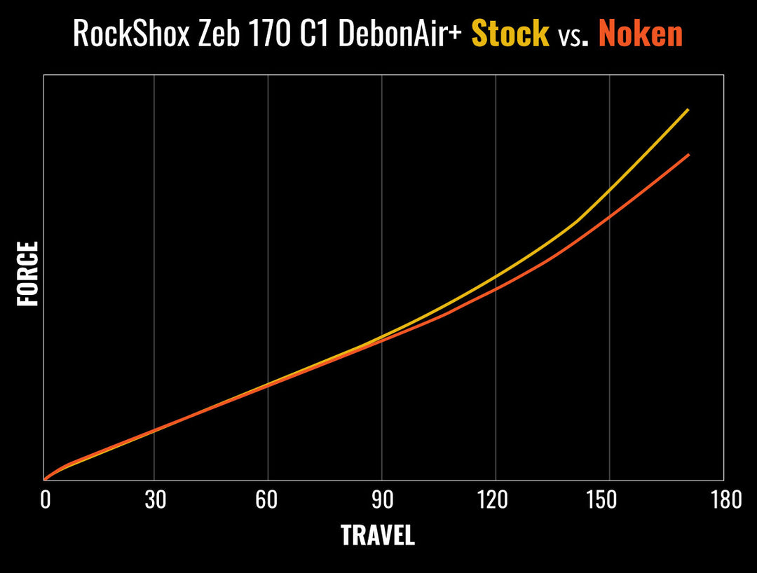 The graph above illustrates the change in spring curve with the Noken vs. the stock Zeb 170mm configuration (C1 Debonair+ generation with 1 Token).
